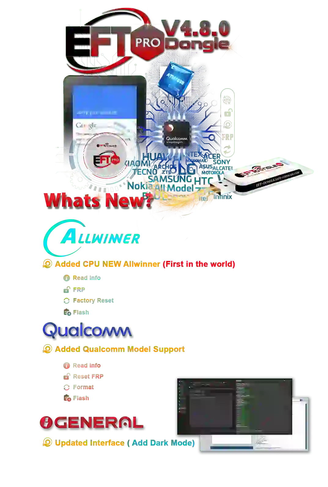 EFT Pro Dongle 4.8.4 has new update arrived, EFT Pro Dongle is the most popular and powerful tool in the GSM market, This tool use or free, EFT Pro Dongle Tool supports reading info, FRP, factory reset, and flashing, EFT Pro Dongle tool Tool you can Unlock, FRP lock, all phones use free, We know those who use this tool don't need any other tools, EFT Pro Dongle tool You can use by downloading.